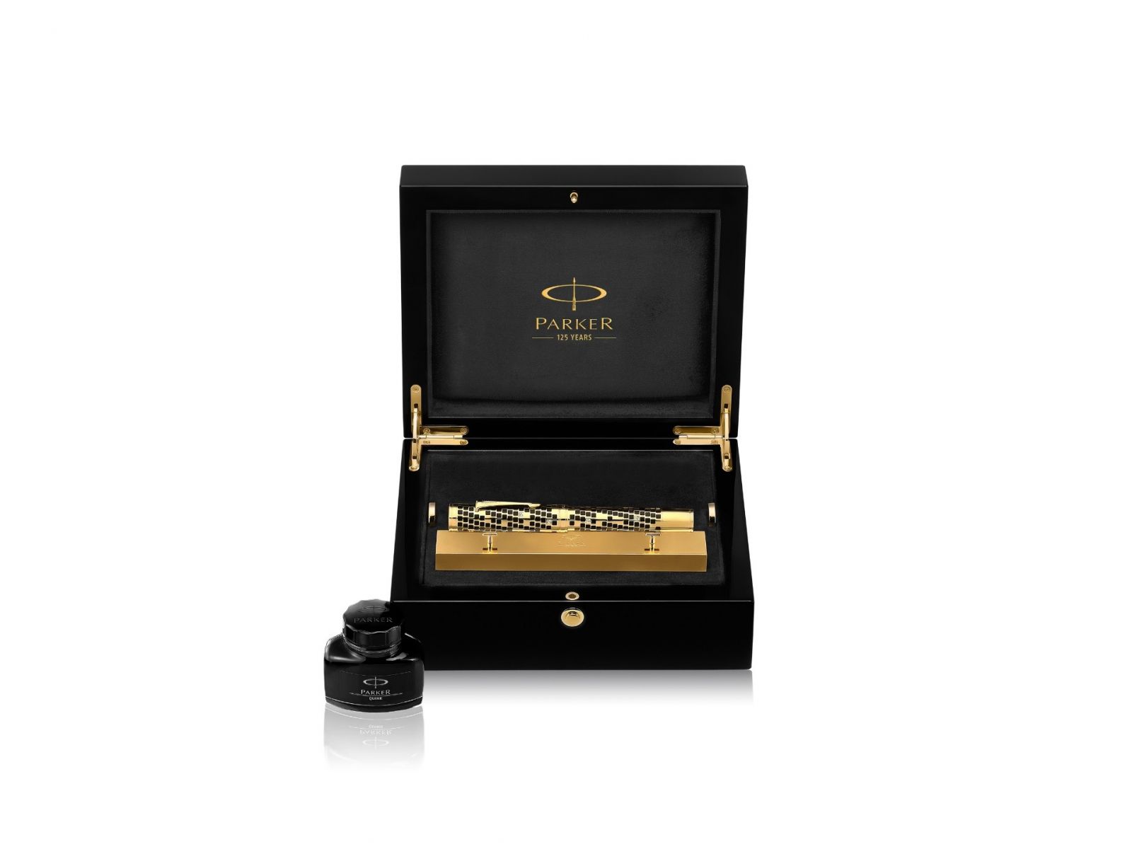 Bút đựng trong hộp gỗ sơn mài màu đen sang trọng, đi cùng bộ quà tặng gồm lọ mực Parker Quink Black và giá đỡ bút mạ vàng.